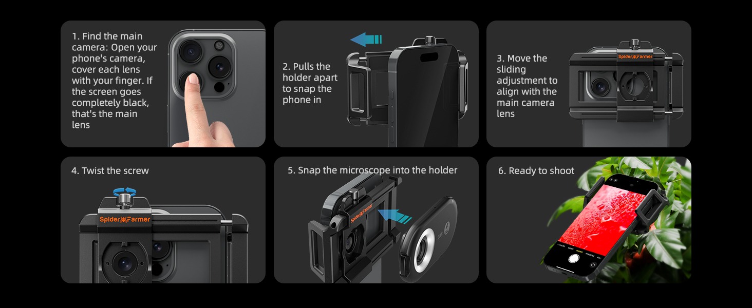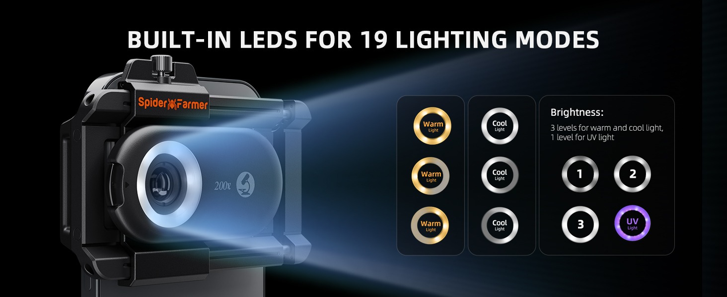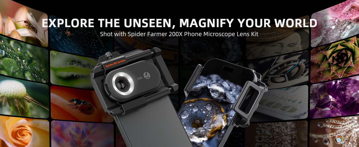 Mobilní mikroskop Spider Farmer 200X je navržený pro detailní kontrolu trichomů, listů i celkového stavu rostlin přímo přes chytrý telefon. Díky vysokému zvětšení 200x, LED/UV osvětlení a CPL filtru umožňuje zachytit ostrý a kontrastní obraz bez rušivých odlesků. Klipová konstrukce je lehká, skladná a připravená k rychlému použití bez nutnosti instalace aplikací. Ideální pro přesné sledování zralosti rostlin a lepší rozhodování při sklizni.