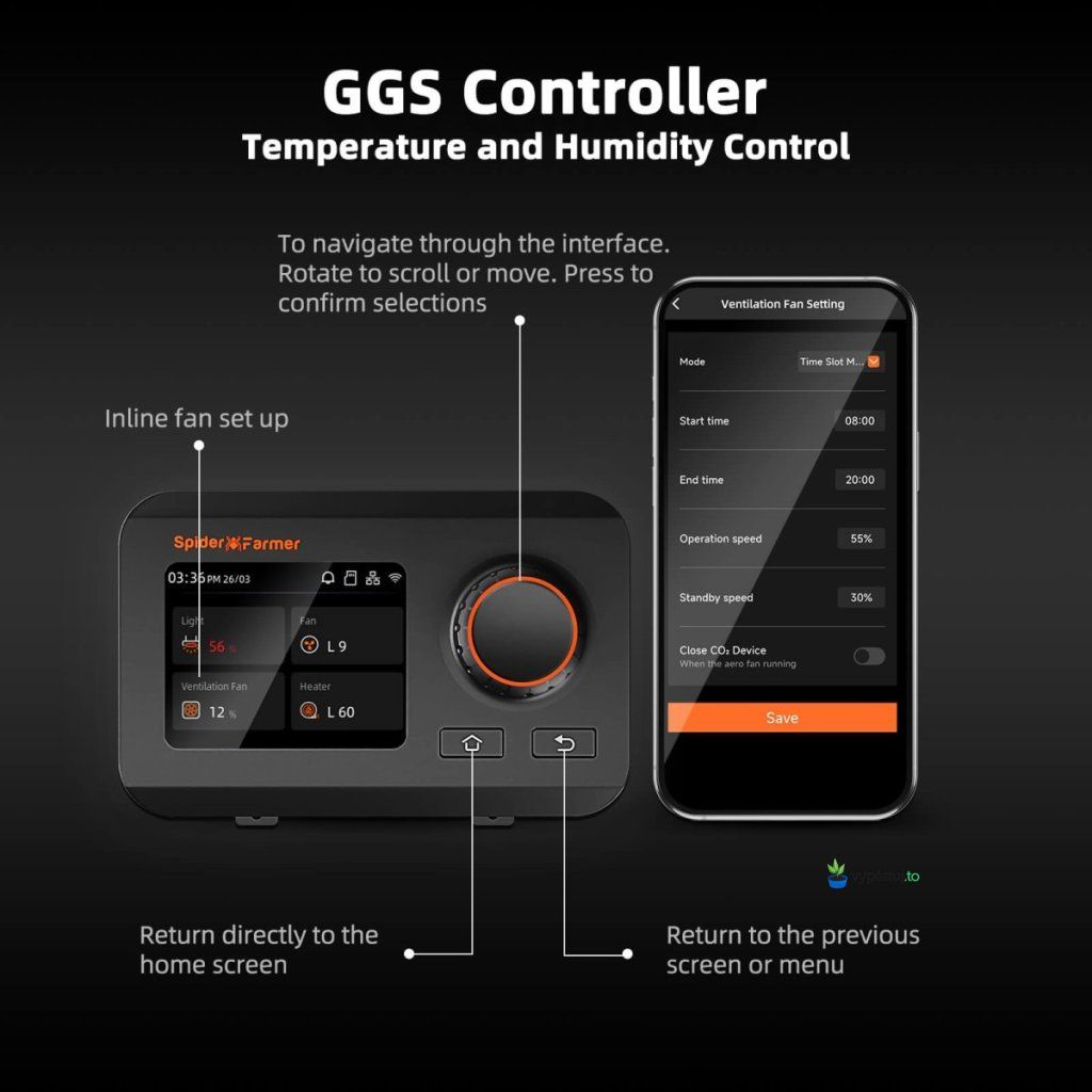Systém umožňuje nastavení rychlosti ventilátoru, časování start/stop i různé provozní režimy včetně automatické regulace podle teploty a vlhkosti. Podporuje také řízení CO₂ zařízení a napojení na další GGS příslušenství, takže se dá dobře integrovat do kompletního pěstebního setupu.