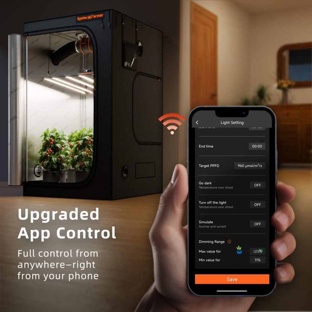 Možnost ovládání světla přes aplikaci Spider Farmer odkudkoliv. - PPFD režim (vyžaduje senzor)