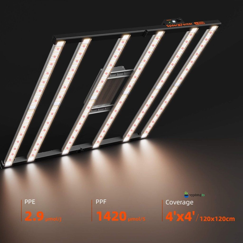 Spider Farmer SE5000 je výkonné LED grow světlo o příkonu 480 W s moderními Bridgelux diodami a vysokou účinností až 2,9 µmol/J. Poskytuje rovnoměrné pokrytí plochy 120 x 120 cm a plné spektrum vhodné pro celý pěstební cyklus. Díky Bluetooth a WiFi připojení lze světlo pohodlně ovládat přes aplikaci Spider Farmer. Efektivní chlazení, nízká spotřba a možnost stmívání z něj dělají ideální řešení pro středně velké grow setupy.
