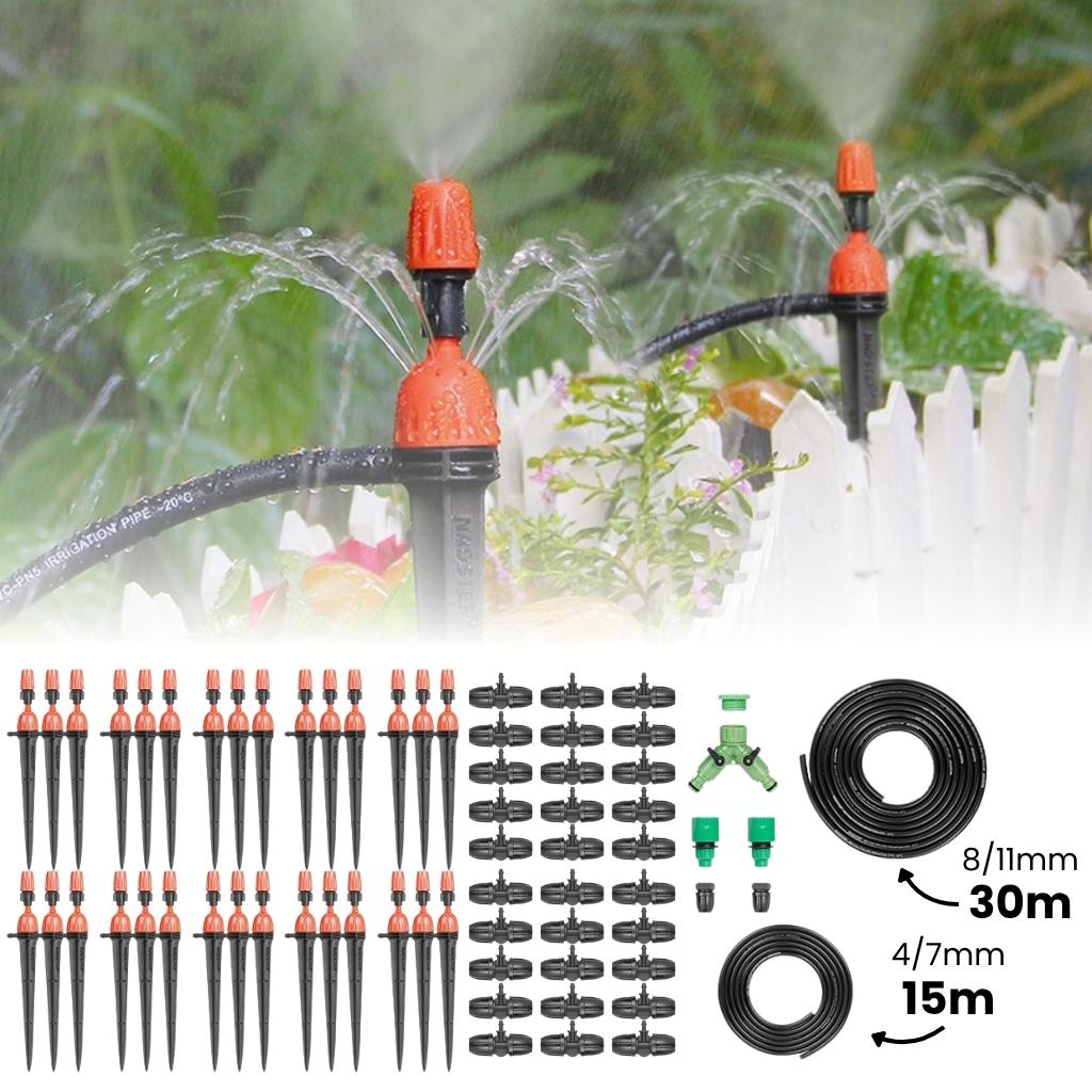 Zavlažovací systém s kolíky do zeminy se nejčastěji využívá pro zavlažování trávníku, venkovních květináčů a záhonů nebo jen jako zálivka půdy ve skleníku. Tato sada obsahuje 30 kolíků do země dvojitou horní tryskou, 30m rozvodové hadice a celkem 15m kapilární hadice. Vhodné pro zahradní instalace zavlažování během jara a léta.